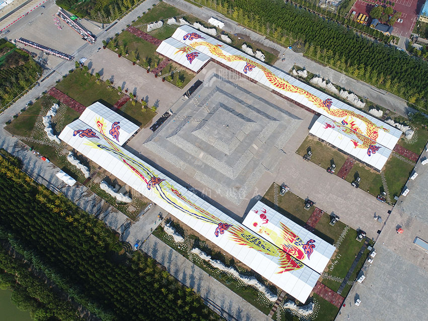 由上图我们可以看到,篷房上面由腾飞向上的龙、凤及两侧的色带组成,龙凤形似阿拉伯数字“11”,